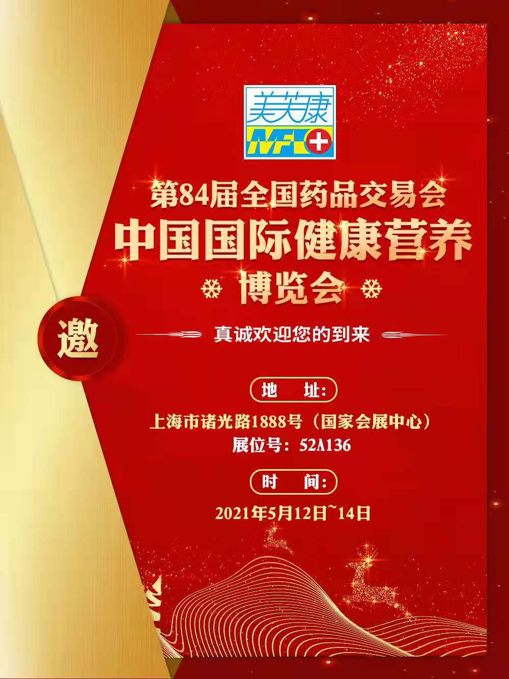 第84屆全國(guó)藥品交易會(huì)暨中國(guó)國(guó)際健康營(yíng)養(yǎng)博覽會(huì)將于2021年5月12-14日在上海市諸光路1888號(hào)(國(guó)家會(huì)展中心)舉行,屆時(shí)陜西美芙康生物科技有限公司將參加此次展會(huì)。