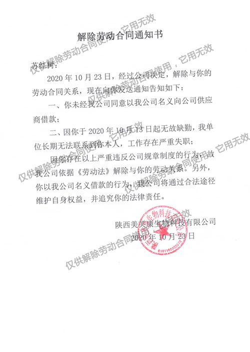 美芙康集團與蘇紅樹同志解除勞動合同通知書!