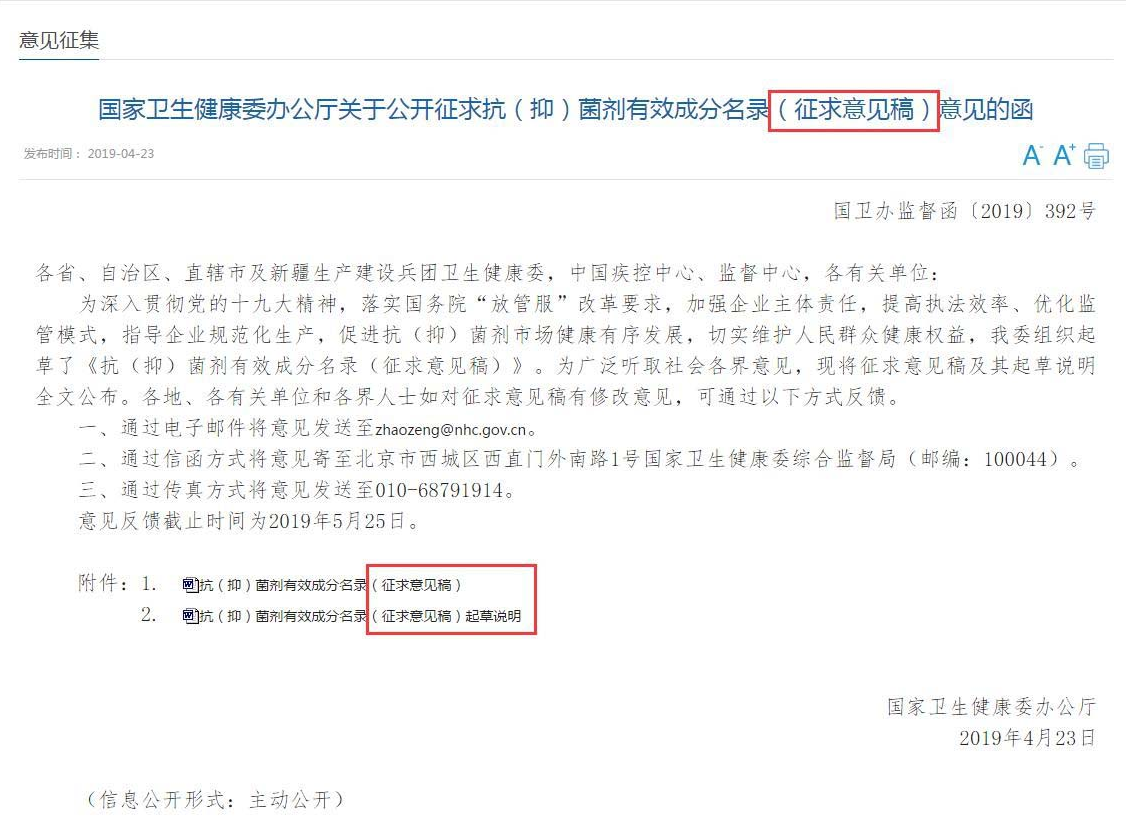國(guó)家衛(wèi)生健康委辦公廳于2019年4月23日發(fā)布了《關(guān)于公開征求關(guān)于抗(抑)菌劑有效成分目錄的意見的函》(國(guó)衛(wèi)辦監(jiān)督函【2019】392號(hào))。