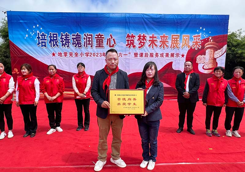 長武縣洪家鎮(zhèn)馬寨完全小學校長王偉代表學校師生向美芙康集團贈送捐贈牌匾表示感謝。