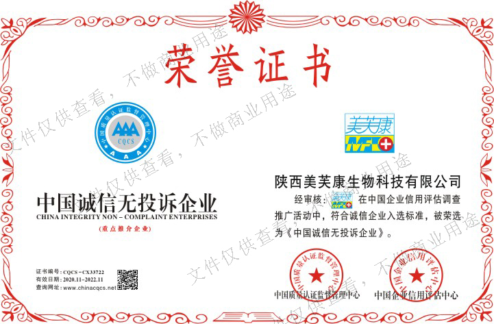 經(jīng)審核:陜西美芙康生物科技有限公司,在中國企業(yè)信用評(píng)估調(diào)查推廣活動(dòng)中,符合誠信企業(yè)入選標(biāo)準(zhǔn),被榮選為《中國誠信無投訴企業(yè)》。